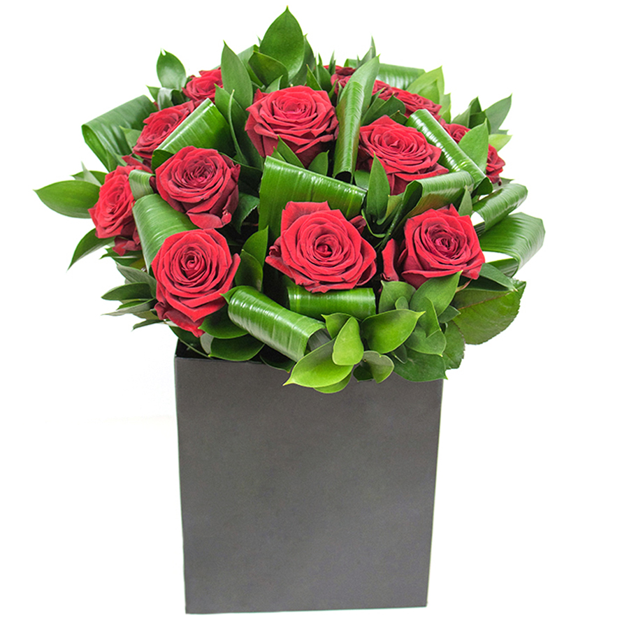 Add a touch of elegance with our chic red rose bouquet, featuring vibrant aspidistra leaves and soft ruscus. This beautifully designed arrangement enhances any décor with its harmonious colors and textures.