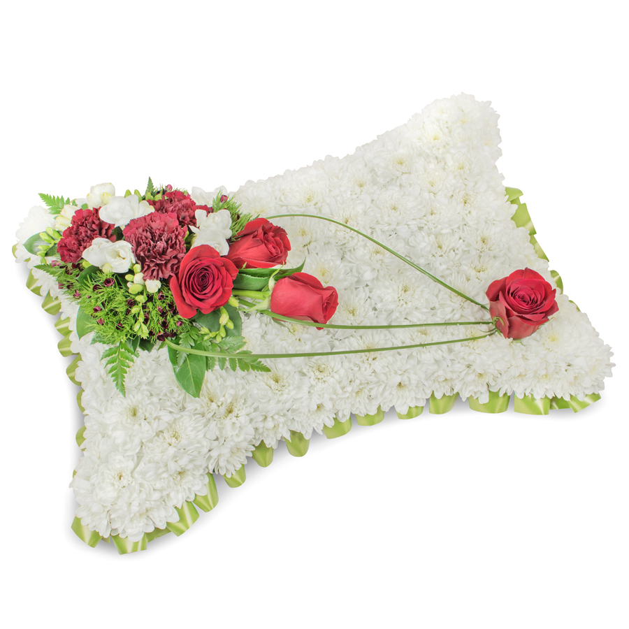 Show your support with our sophisticated sympathy bouquet. This refined arrangement includes a selection of white chrysanthemums, red roses, white freesias, and dark red carnations, beautifully enhanced by dianthus and bear grass for an elegant finish.