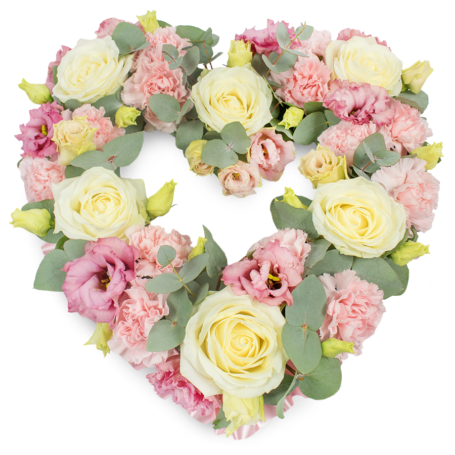 Show your love and gratitude with our beautiful open heart tribute bouquet. This exquisite arrangement features a vibrant mix of pure white roses, charming pink carnations, graceful pink lisianthus, and lush eucalyptus, all hand-selected for maximum freshness and appeal.
